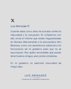 «Durante estos cinco años he luchado contra la impunidad y la corrupción. En coherencia con ello, envié el informe que revela irregularidades en @ARSSeNaSaRD», comenzó el jefe de Estado su contundente escrito.