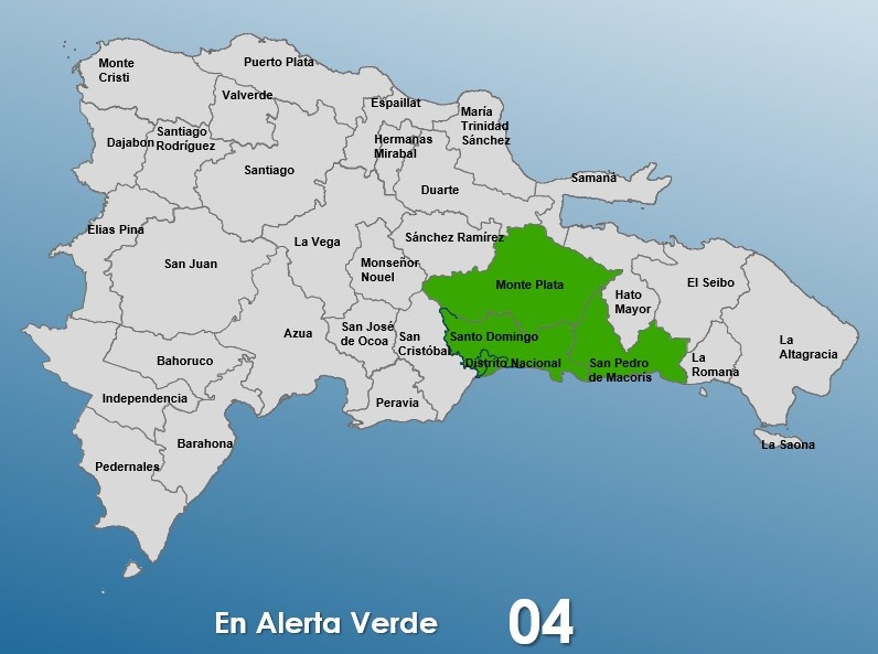 Santo Domingo, 6 ago (EFE).- El Centro de Operaciones de Emergencias (COE) emitió este miércoles la alerta verde por lluvias para El Distrito Nacional, Santo Domingo y San Pedro, debido a la incidencia de una vaguada.
