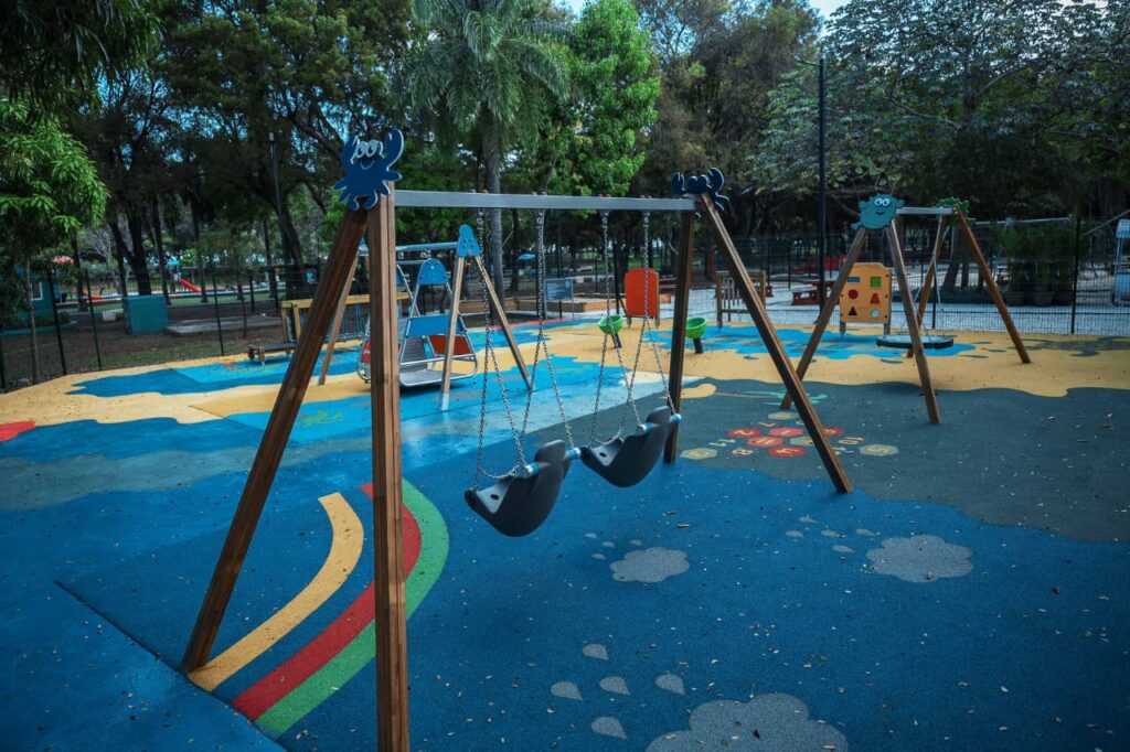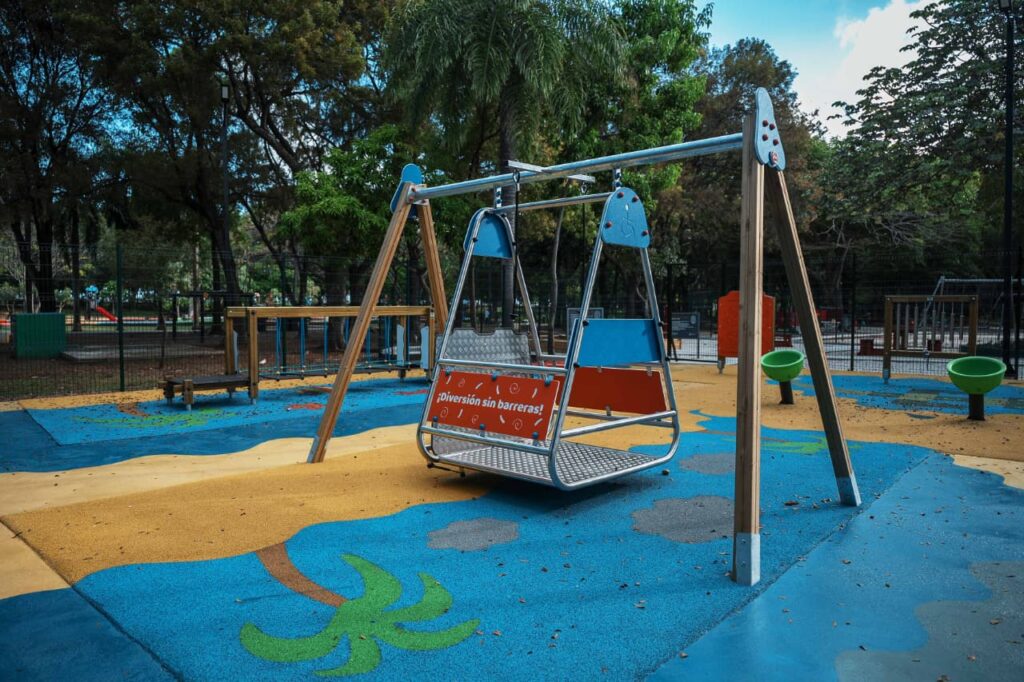 Asimismo, el área cuenta con infraestructura que garantiza accesibilidad universal, incluyendo superficies de caucho para mayor seguridad, aceras tipo rampa, iluminación LED eficiente, señalización informativa y mobiliario urbano, como mesas de picnic y espacios destinados a terapias sensoriales.