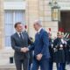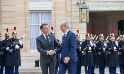 El presidente de Francia, Emmanuel Macron saluda a su homólogo dominicano Luis Abinader en el palacio del Elíseo en París el martes 24 de marzo del...