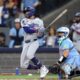 Mookie Betts #50 de los Dodgers de Los Ángeles batea un sencillo de dos carreras contra Kevin Gausman #34 de los Toronto Blue Jays durante la...