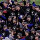 Miembros de los Toronto Blue Jays posan y celebran tras derrotar a los New York Yankees en el cuarto juego de la Serie Divisional de la...