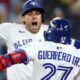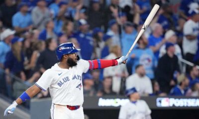 Vladimir Guerrero Jr. observa su sexto cuadrangular de los playoffs en el sexto Juego de la Serie de Campeonato de la Liga Americana. (AFP) Toronto, Canadá...