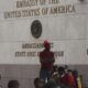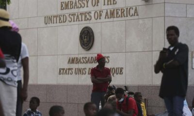 Personas desplazadas de sus casas por pandillas armadas se congregan a las afueras de la embajada de Estados Unidos en Puerto Príncipe, Haití. (AP) Estados...