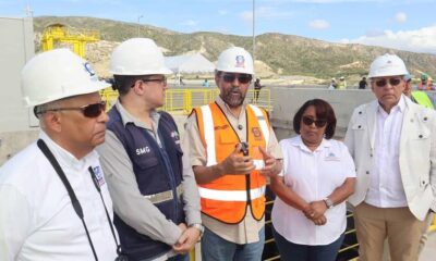 El director ejecutivo del Indrhi, Olmedo Caba Romano, (centro), junto al ingeniero geólogo Osiris de León (derecha), durante las pruebas de las compuertas de la Presa...