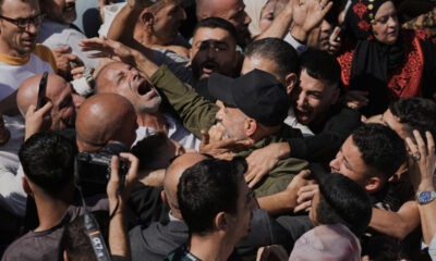 Presos palestinos son recibidos tras ser liberados de una prisión israelí tras un acuerdo de alto el fuego entre Israel y Hamás, en la ciudad cisjordana...