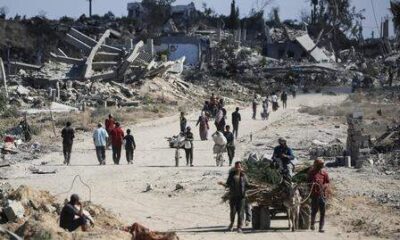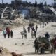 Palestinos desplazados caminan junto a edificios destruidos mientras regresan a sus hogares en la zona de Al-Zahra, al norte del campo de refugiados de Nuseirat, en...