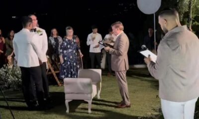 El exembajador estadounidense Wally Brewster oficia la boda de José Fernández y Jeremy Gottschalk en Camp David Ranch, Santiago, acompañados de familiares y amigos. (FUENTE EXTERNA)...
