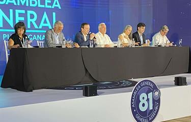 El presidente de la Sociedad Interamericana de Prensa (SIP), José Roberto Dutriz (c), junto al director ejecutivo de la SIP, Carlos Lauría (3-i), hablan durante el...