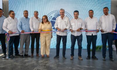 El presidente Luis Abinader mientras cortaba la cinta simbólica durante el acto de entrega de obras en la provincia Santiago Rodríguez, este 21 de febrero del...