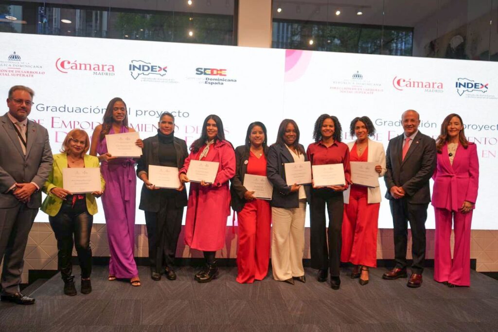 Madrid, España. – 24 de noviembre de 2025.- En el marco de la Semana Dominicana en España (SEDE 2025), celebrada recientemente en la ciudad de Madrid, la Dirección de Desarrollo Social Supérate graduó la primera cohorte de 15 egresadas del programa Mujeres SuperEmprendedoras, quienes gracias a su esfuerzo y dedicación han logrado consolidar iniciativas productivas que contribuyen al desarrollo económico de comunidades y al bienestar de sus familias.