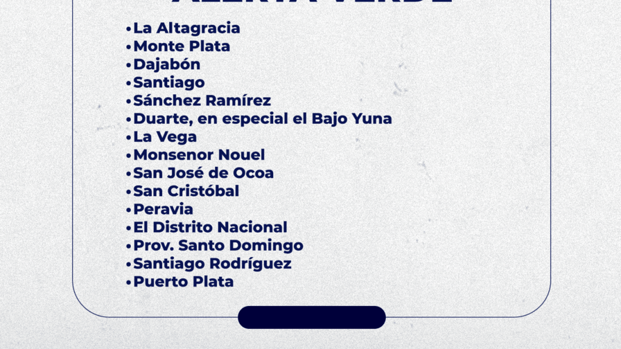Las provincias en alerta verde son: Monseñor Nouel, Distrito Nacional, La Altagracia, San José de Ocoa, Duarte (en especial el Bajo Yuna), Santo Domingo, Dajabón, San Cristóbal, Santiago, Santiago Rodríguez, La Vega, Peravia, Sánchez Ramírez, Puerto Plata y Monte Plata.