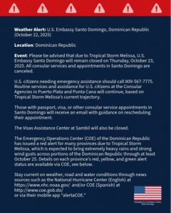 Santo Domingo.- La Embajada de los Estados Unidos en República Dominicana anunció nuevamente la suspensión de sus servicios consulares, esta vez para el jueves 23 de octubre de 2025, debido a los efectos de la tormenta tropical Melissa.