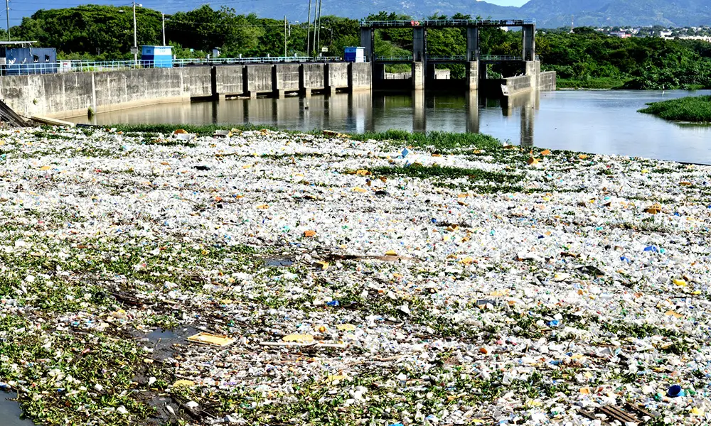 Santiago. La salida de operación durante más de dos semanas de la barrera flotante instalada para la recolección de desechos, ha dejado al río Yaque del Norte repleto de plástico.