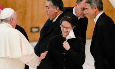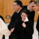 El papa Francisco estrecha la mano de la hermana Raffaella Petrini, secretaria general de la Gobernación del Estado de la Ciudad del Vaticano, en el Vaticano,...