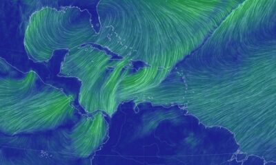 Esta imagen muestra la dirección del viento del norte y del noreste, que son vientos frescos, afectando al territorio dominicano este martes. (EARTH NULLSCHOOL) RD...