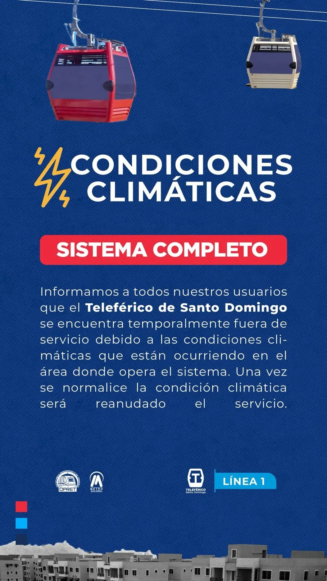 Santo Domingo, RD – La Línea 1 del Teleférico de Santo Domingo, que conecta la estación Gualey con la estación Charles de Gaulle (T1-T4), se encuentra temporalmente fuera de servicio debido a las condiciones climáticas que afectan el área de operación del sistema.