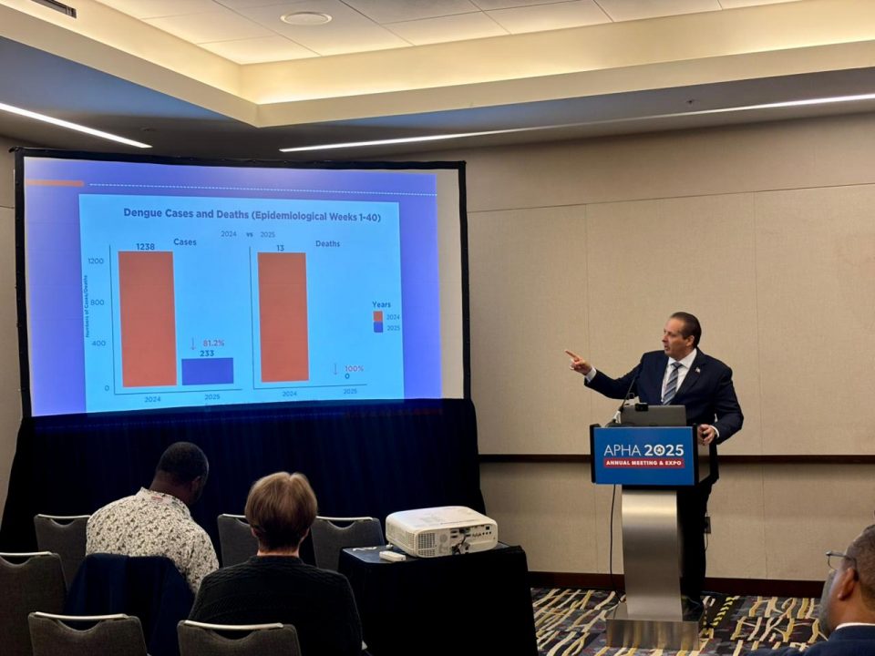 Washington, D.C., Estados Unidos. – El Ministro de Salud Pública, Víctor Atallah, durante la Convención Anual de la Asociación Americana de Salud Pública (APHA) 2025, compartió la experiencia y los resultados de la implementación del Plan Nacional de Prevención, Control y Educación del dengue en República Dominicana que permitió reducir a cero las muertes a causa de esta enfermedad.